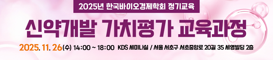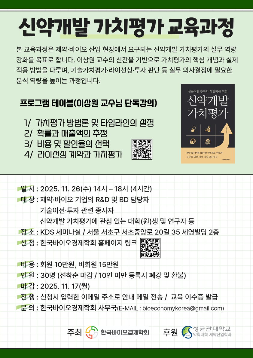 한국바이오경제학회는 산업 현장에서 요구되는 신약개발 가치평가의 실무 역량 강화를 위해 「신약개발 가치평가 교육과정」을 개최합니다.